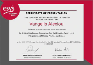 Προφορική ανακοίνωση O-130 στη Fast Track συνεδρία Translational Research, Innovation, and Equity in Vascular Surgery, στο 39ο Ετήσιο Συνέδριο ESVS, Κωνσταντινούπολη.Οι κατευθυντήριες οδηγίες κλινικής πρακτικής (CPGs) συνθέτουν τα νεότερα δεδομένα, τη συναίνεση των ειδικών και τα αποτελέσματα κλινικών μελετών σε δομημένες συστάσεις, προσφέροντας ένα «οδικό χάρτη» για τους επαγγελματίες υγείας. Ωστόσο, οι CPGs συχνά είναι εκτενείς, περίπλοκες και δύσχρηστες στην καθημερινή κλινική πράξη, ιδιαίτερα σε πολύπλοκα πεδία όπως η αγγειοχειρουργική. Τα γενικά μοντέλα μεγάλων γλωσσών (LLMs) παρουσιάζουν σημαντικές προκλήσεις όταν κρίσιμες πληροφορίες είναι διάσπαρτες σε μακροσκελή ιατρικά κείμενα που δεν περιλαμβάνονται στο training τους, και ο κλινικός τους συλλογισμός πρέπει να ελέγχεται αυστηρά ως προς την εγκυρότητα και την ακρίβειά του.